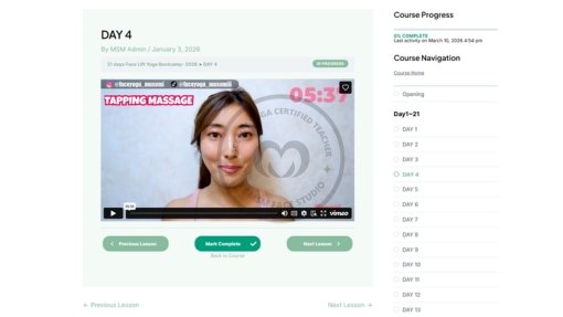 The 21-Day Face Lift Yoga Bootcamp is a focused daily routine designed to activate facial muscles, improve circulation, and restore natural vitality to your skin.